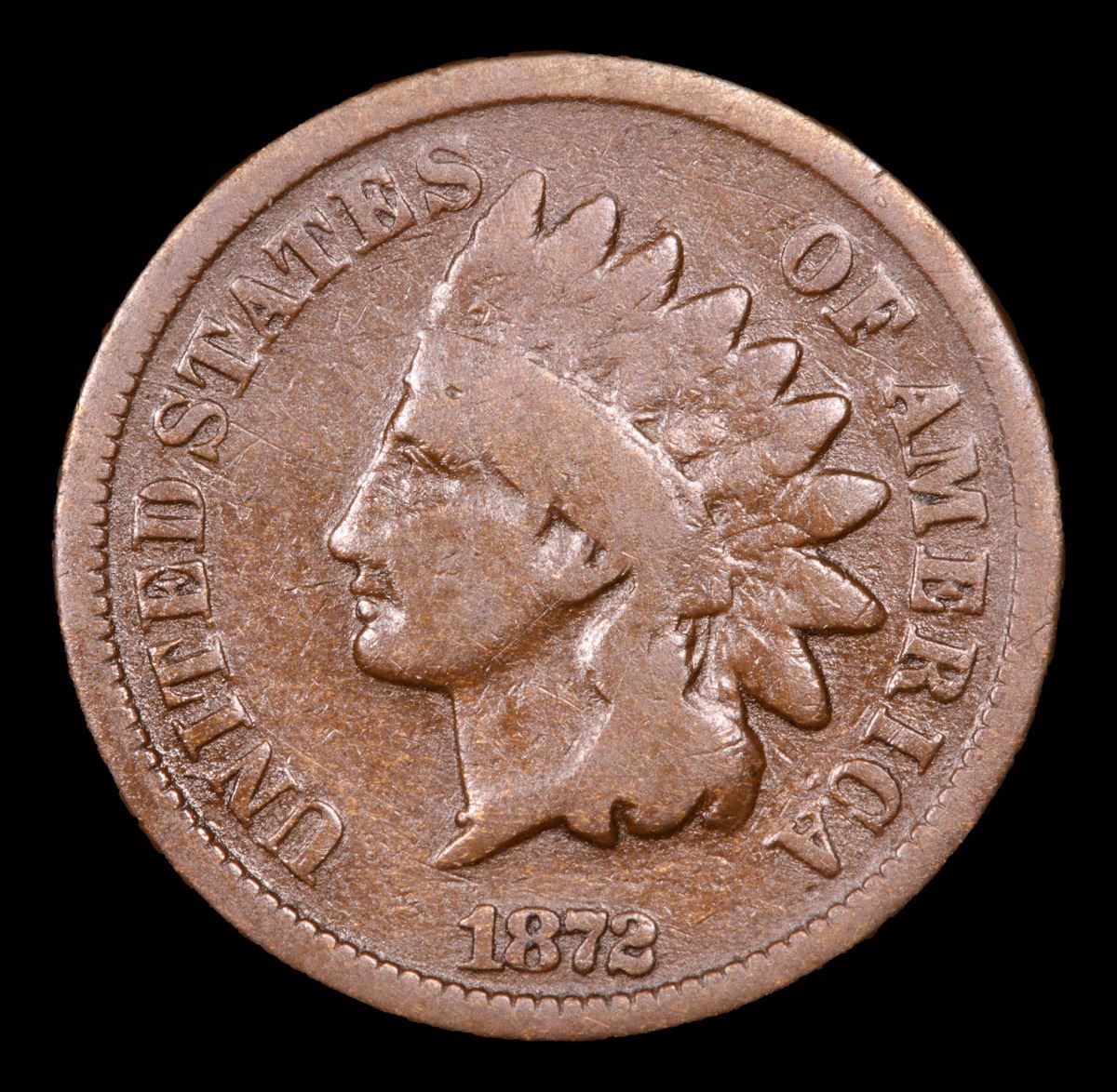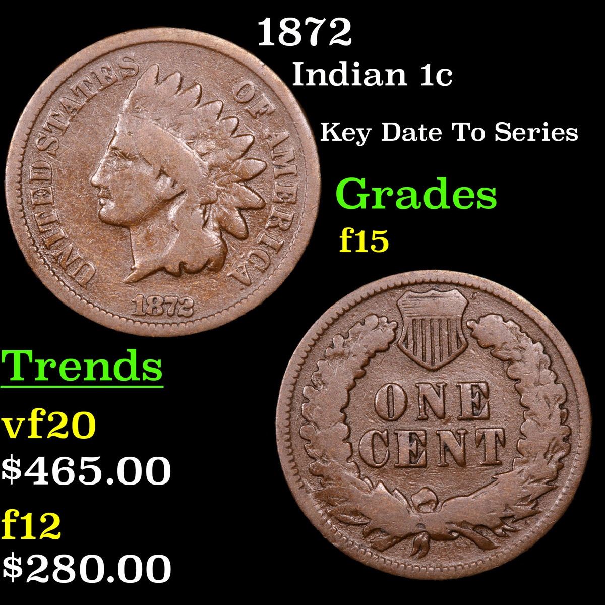 1872 Key Date To Series . Indian Cent 1c Grades f+. Per PCGS : "The 1872 Indian Cent has one of the lowest mintages in the series. It is very similar to the 1871, even though the 1871 has a lower mintage the 1872 seems to carry a higher premium in most grades. A semi key date to the indian Cent series with approximately 5,000 coins in existence, in all grades combined. Making a very tough issue."