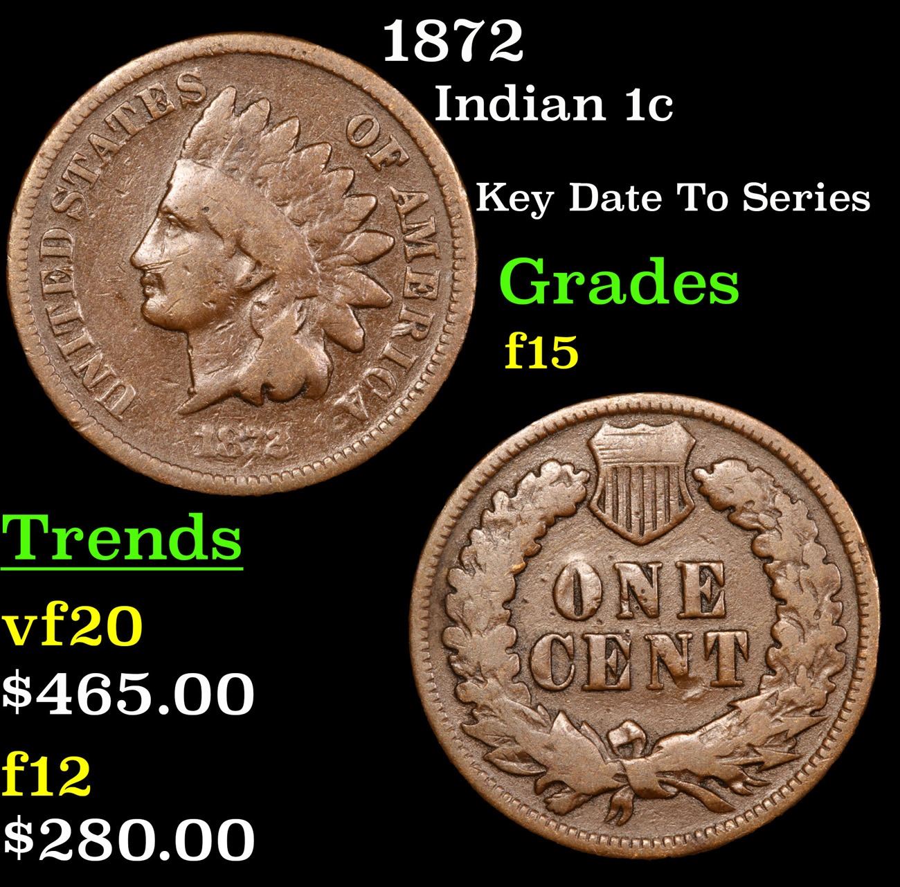 1872 Key Date To Series . Indian Cent 1c Grades f+. Per PCGS : "The 1872 Indian Cent has one of the lowest mintages in the series. It is very similar to the 1871, even though the 1871 has a lower mintage the 1872 seems to carry a higher premium in most grades. A semi key date to the indian Cent series with approximately 5,000 coins in existence, in all grades combined. Making a very tough issue."