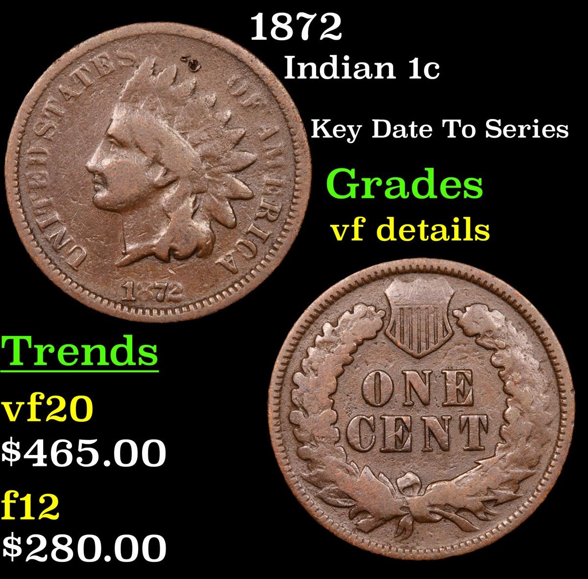 1872 Key Date To Series . Indian Cent 1c Grades vf details. Per PCGS : "The 1872 Indian Cent has one of the lowest mintages in the series. It is very similar to the 1871, even though the 1871 has a lower mintage the 1872 seems to carry a higher premium in most grades. A semi key date to the indian Cent series with approximately 5,000 coins in existence, in all grades combined. Making a very tough issue."