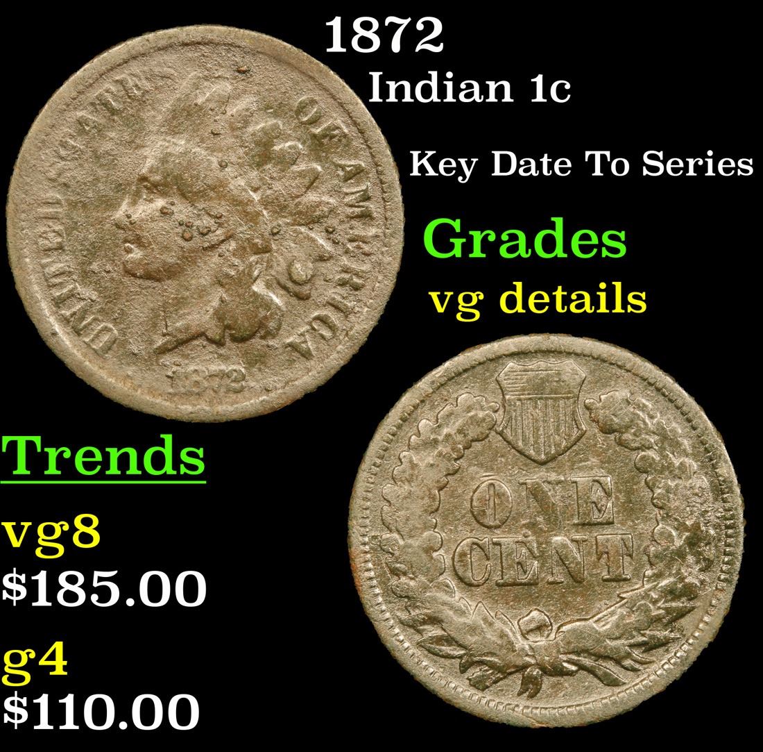 1872 Key Date To Series . Indian Cent 1c Grades vg details. Per PCGS : "The 1872 Indian Cent has one of the lowest mintages in the series. It is very similar to the 1871, even though the 1871 has a lower mintage the 1872 seems to carry a higher premium in most grades. A semi key date to the indian Cent series with approximately 5,000 coins in existence, in all grades combined. Making a very tough issue."