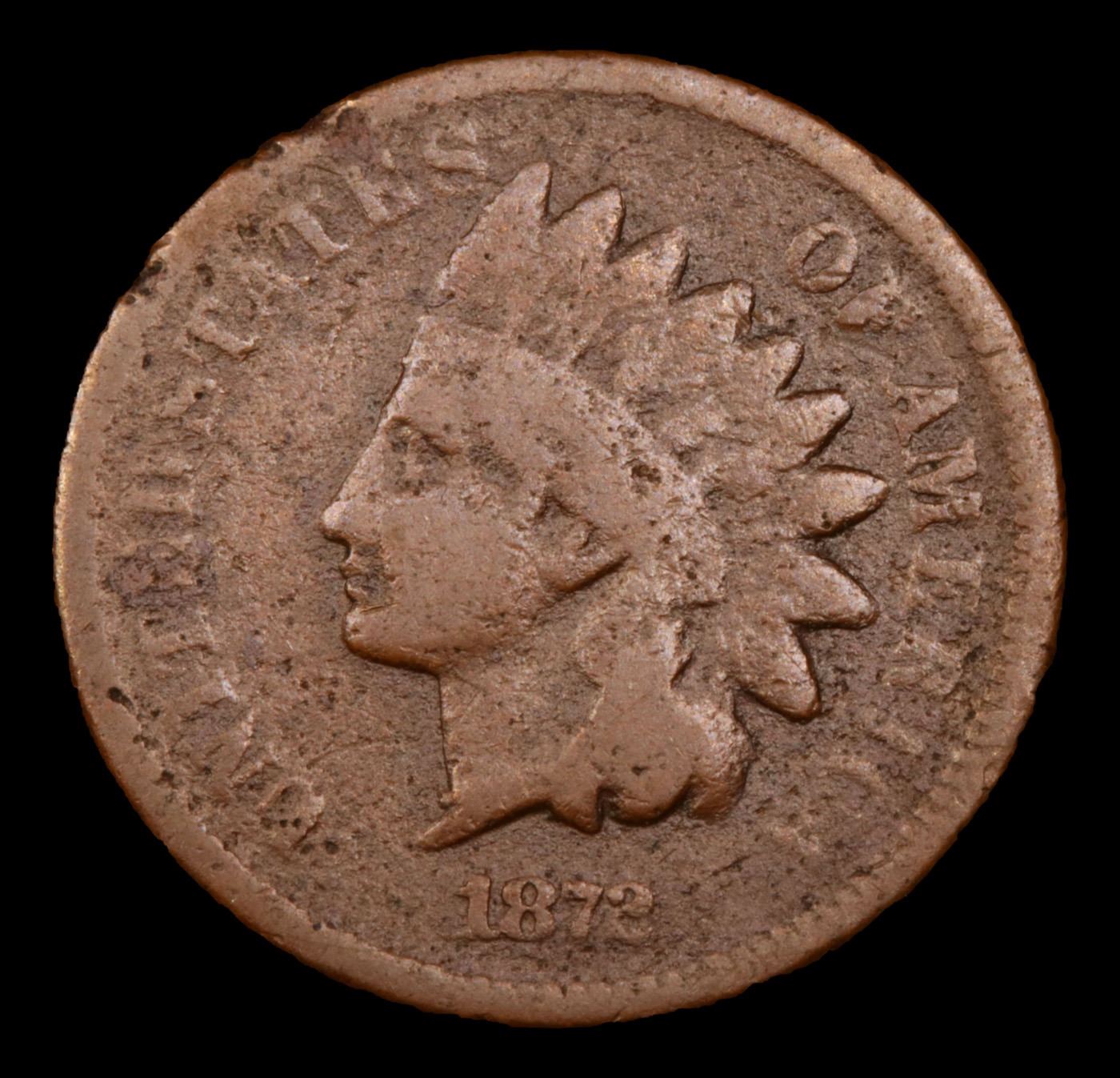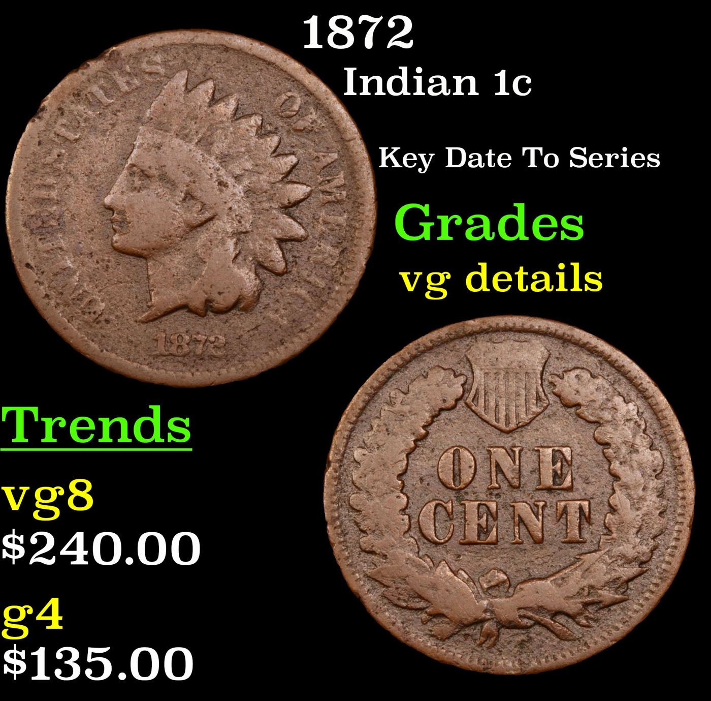1872 Indian Cent 1c Grades vg details. Per PCGS : "The 1872 Indian Cent has one of the lowest mintages in the series. It is very similar to the 1871, even though the 1871 has a lower mintage the 1872 seems to carry a higher premium in most grades. A semi key date to the indian Cent series with approximately 5,000 coins in existence, in all grades combined. Making a very tough issue."