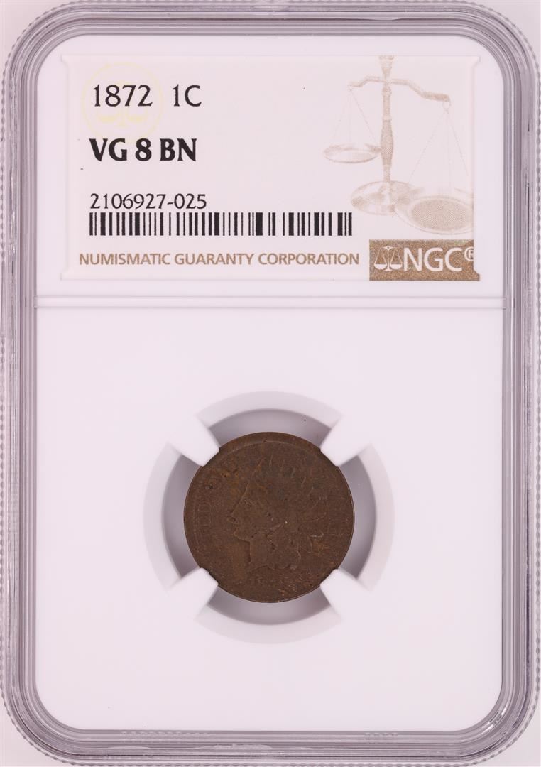 One 1872 Indian Head Cent Coin NGC VG8BN. NGC Certified.
