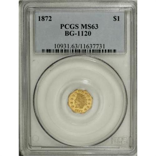 <B>1872 $1 Indian Octagonal 1 Dollar, BG-1120, Low R.5, MS63 PCGS.</B></I> The flashy butter-gold fields are pleasantly smooth, and the portrait and wreath are precisely struck. The central reverse legends are consistently brought up, with only a hint of mint-made roller marks. There are only 29 different Period Two octagonal dollar varieties, regardless of date or maker. Population: 7 in 63, 13 finer (11/07).<BR><BR><b>Shipping:</b> Coins & Currency (<a target="_blank" href="http://www.heritageauctions.com/common/shipping.php">view shipping information</a>)