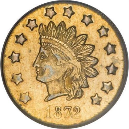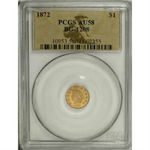 <B>1872 $1 Indian Round 1 Dollar, BG-1208, Low R.6, AU58 PCGS.</B></I> A radiant apricot-gold representative of this noteworthy variety. TOKEN appears in the legend, a last-ditch effort to skirt an 1864 Federal law prohibiting private coinage. A prooflike example with bold borders and slight weakness of strike at the centers. The portrait has just a hint of ice-blue on the highpoints where friction has occurred.<BR><BR><b>Shipping:</b> Coins & Currency (<a target="_blank" href="http://www.heritageauctions.com/common/shipping.php">view shipping information</a>)