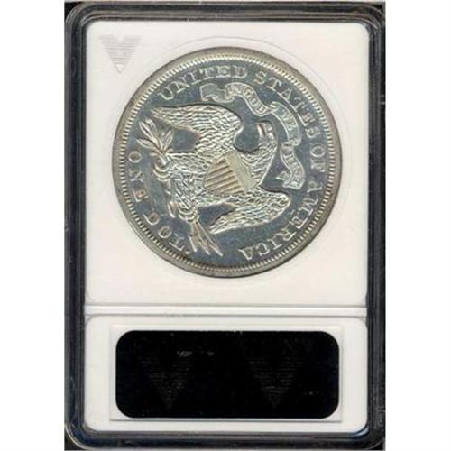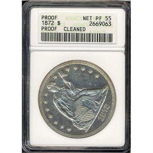 <b>1872 Liberty Seated Dollar. ANACS graded Proof. Net Proof 55 Cleaned.</b> Some signs of light circulation wear on the high points as well as minor abrasions in the fields, yet the sharp relief of a Proof as well as the still-swirling mirror effect from the polished dies, points to its origin. Only 950 Proofs were minted in 1872 <b>(PCGS # 7020)</b>