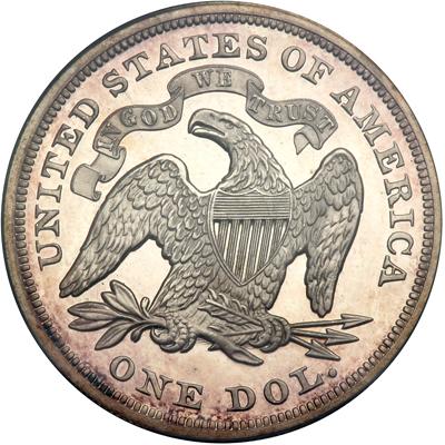 1872 Liberty Seated Dollar. PCGS graded Proof 64 Deep Cameo. Mostly brilliant with a hint of light golden toning around the edges. 950 Proofs minted. Shimmering mint brilliance is seen over each side of this fully struck late-issue Seated Liberty dollar. As expected for the grade, devices and foursquare and bold throughout with detail aplenty on Liberty and the shield, the stars and her hair. Turning to the other side, the eagle is exemplary. All feathers shows great detail. The shield is complete horizontal and vertically. The coin's former owners took loving care of it. Now if you are a confirmed Seated Liberty Proof fiend you can enjoy the pleasure of its company. Pop 4; 2 finer; 1 in 65; 1 in 66. (PCGS # 97020).