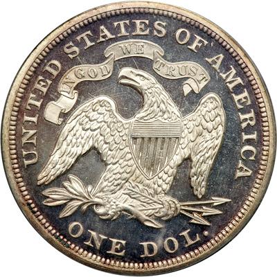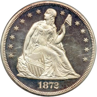 1872 Liberty Seated Dollar. PCGS graded Proof 64 Deep Cameo. Mostly untoned with a hint of lilac coloration near the edges. By adding the motto IN GOD WE TRUST on all silver and gold coinage, the Act of March 3, 1865 ushered in a new, if short-lived type for the seated dollar series (1866-73). An always popular issue among collectors because of the size of the coin Proofs are often selected for a high grade sets. Few, however, will have the opportunity to own such an awe-inspiring deep cameo example as this.
