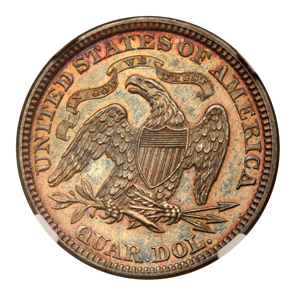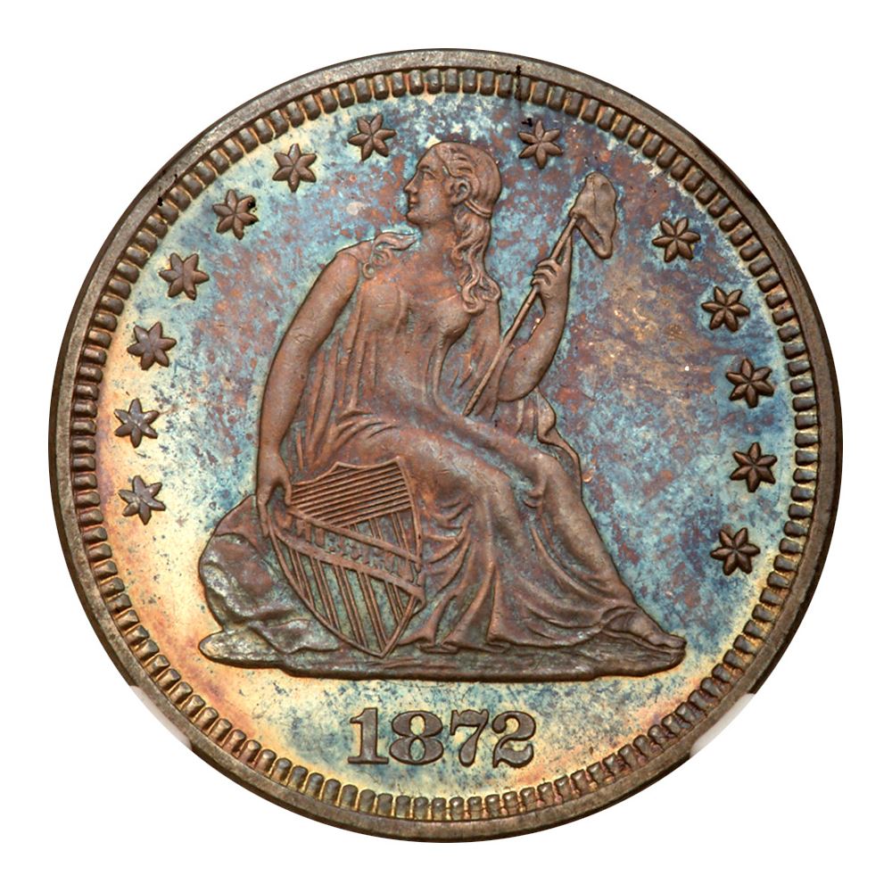 1872. NGC graded MS-67. Nice antique toning with hues of steel-bluish and russet colors on both sides. Not only are the colors intense and glorious, but the surfaces are outstanding. In fact, this is the finest example known technically. Notice how Liberty seems to float above the lustrous fields with her frosted dress and pole. Fantastic eye appeal and a true condition rarity! Pop 1; the finest example graded at both services. Estimated Value 14,000 - UP