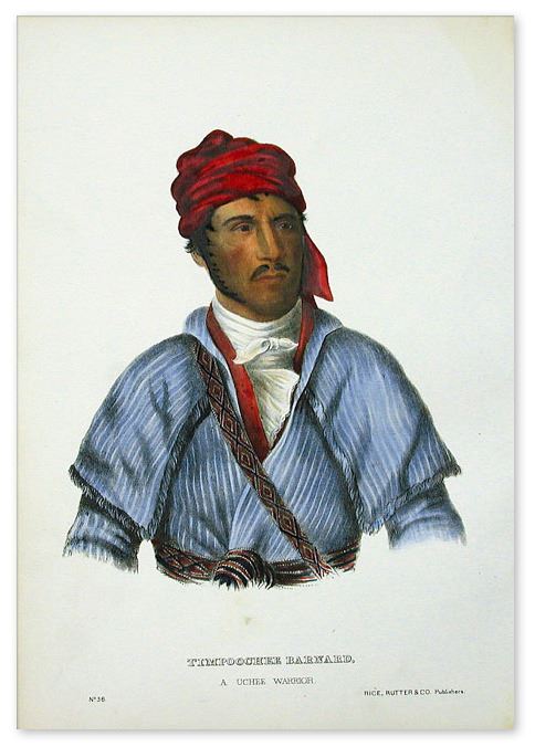 1872 McKenney & Hall print ''Uchee Warrior Timpoochee Barnard'' from the ''History of the Indian Tribes of North America'' series originally published in 1837-1844 by Daniel Rice and James G. Clark in Philadelphia. Measures 7'' x 10.5''. Near fine.