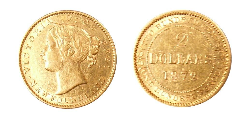 1872 Nfld $2 Gold. EF-AU, shows light scratches on obv.
