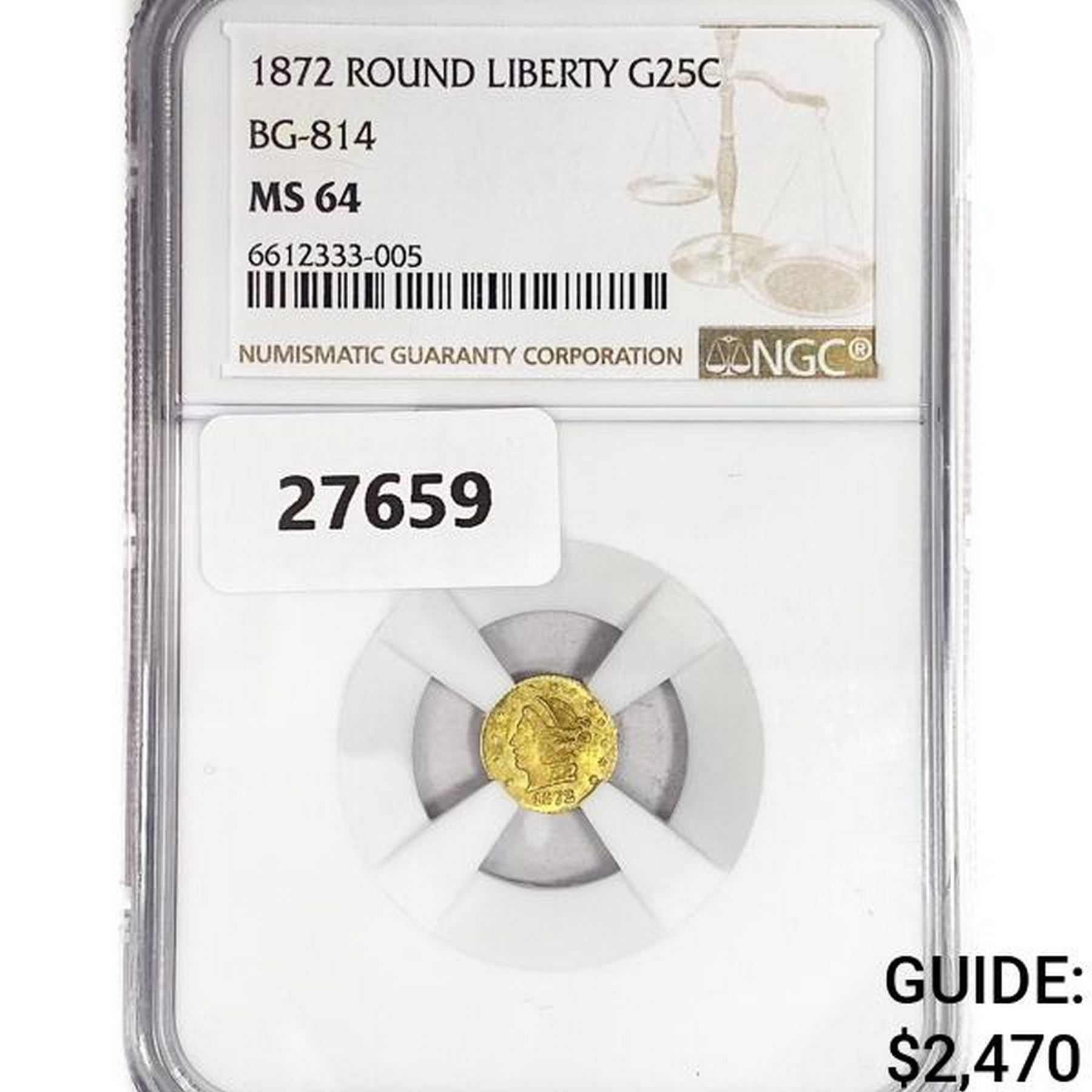 1872 Round California Gold Quarter NGC MS64 BG-814