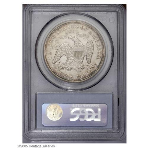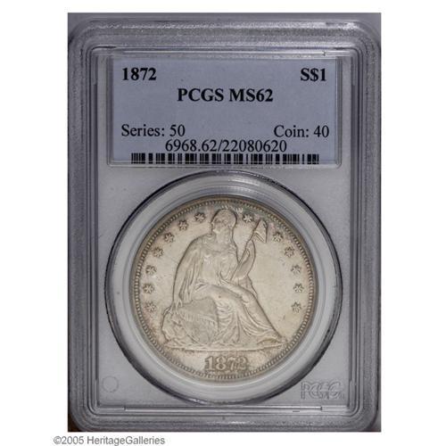 <B>1872<S$1> MS62 PCGS.</B></I> Silver-gray surfaces display wisps of dark blue and lavender patina, and the design elements are well struck. Wispy slide marks are noted in the obverse fields.