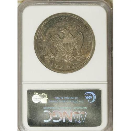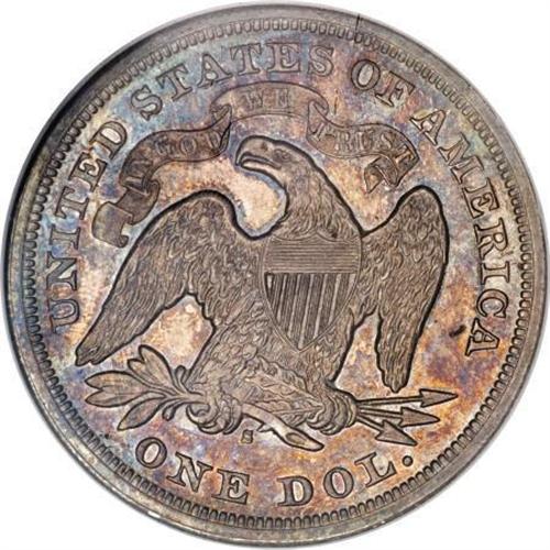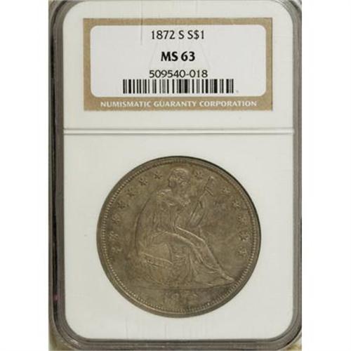 <B>1872-S $1 MS63 NGC.</B></I> The 1872-S is the only collectible Motto San Francisco Seated dollar issue. Two other Motto S-mint issues were struck, but no examples of the 1873-S have ever surfaced, while the 1870-S is a legendary rarity. Only 9,000 1872-S dollars were struck, which compares favorably to the more than 1 million 1872 Seated dollars produced at Philadelphia. Most 1872-S survivors are in VF to AU grades. Only a handful of pieces have been certified as Mint State, none above MS64. The present boldly struck and satiny representative has dusky golden-brown, ruby-red, and ocean-blue toning. The surfaces are remarkably unabraded, even when studied beneath a lens. Census: 4 in 63, 2 finer (2/08).<BR><I>From The Queller Family Collection of Silver Dollars.</B></I><BR><BR><B>Coin Engraver:</B> Christian Gobrecht<BR><BR><b>Shipping:</b> Coins & Currency (<a target="_blank" href="http://www.heritageauctions.com/common/shipping.php">view shipping information</a>)