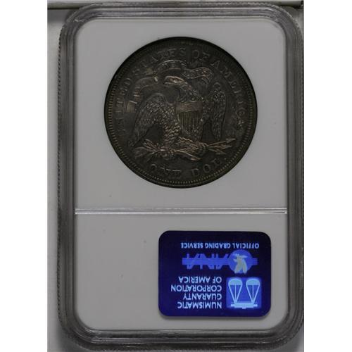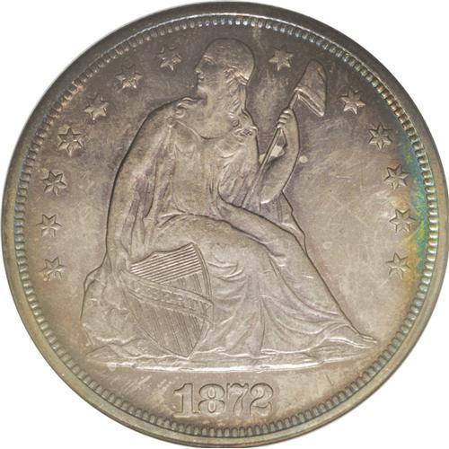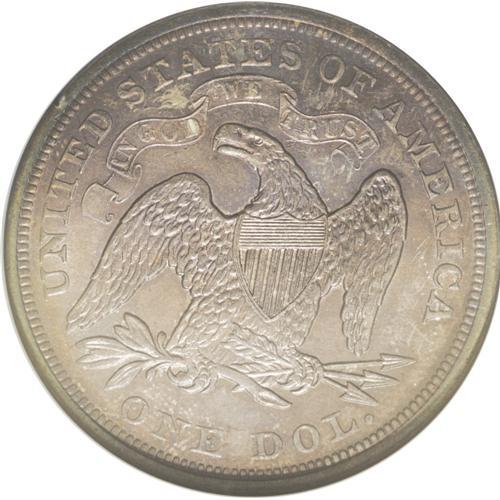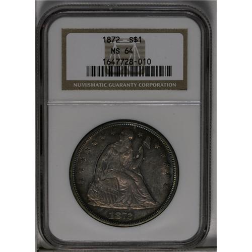 <B>1872<img border='0' src='http://www.heritagecoins.com/images/star.gif' width=10 height=10>$1> MS64 NGC.</B></I> Breen-5491. Electric-blue margins frame dusky golden-brown and plum-mauve interiors. Aside from a small reverse rim nick at 10 o'clock, there are no mentionable marks. The strike is good despite slight softness on the upper obverse periphery. The bases of some date digits are misplaced in Liberty's rock. Census: 21 in 64, 3 finer (6/06).<BR><I>Ex: Superior, 1/03, lot 920, which realized $5,175.</B></I><BR><I>From The Chief Paduke Collection.</B></I>