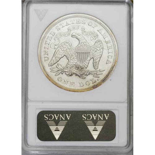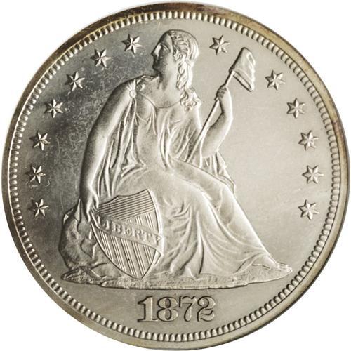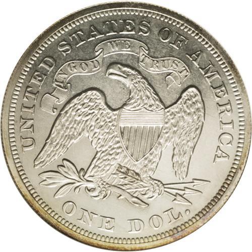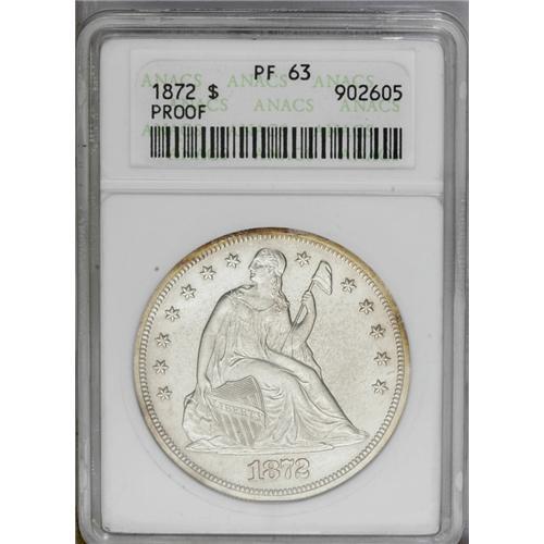 <B>1872<img border='0' src='http://www.heritagecoins.com/images/star.gif' width=10 height=10>$1> PR63 ANACS.</B></I> Essentially brilliant with silvery-white proof surfaces, and with mustard-yellow color confined to the rims on both sides. A pleasing mid-grade proof example.