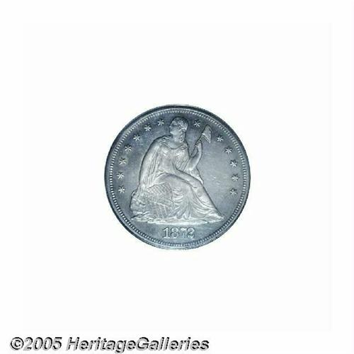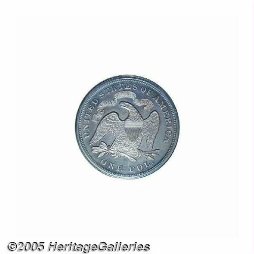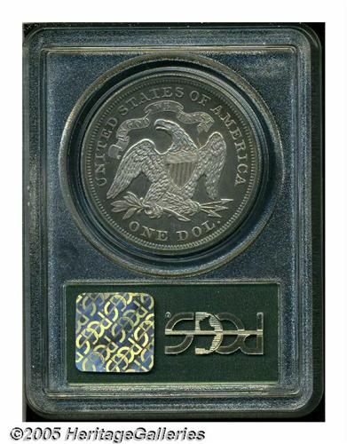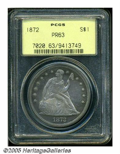 <B>1872<S$1> PR63 PCGS.</B></I> The 1872 is one of the more readily obtainable dates in the With Motto series with 950 proofs produced. PCGS has certified 150 coins in proof format (6/05). This piece is exquisitely struck throughout. Hints of pastel cobalt-blue and golden-brown patina visit the surfaces, which reveal mildly frosted devices against a backdrop of reflective fields. There are no mentionable contact marks, and just a few wispy hairlines are noted in the fields. A truly gorgeous coin for the grade.<BR><I>From The Dr. John L. Pellegrini Collection of Liberty Seated Dollars.</B></I>