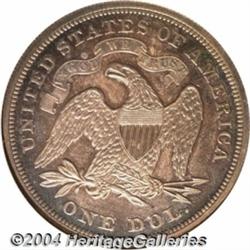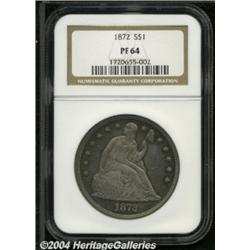 <B>1872<S$1> PR64 NGC.</B></I> One of 950 proofs struck, this example displays medium-blue toning in most of the recessed areas, and magenta coloration in the open fields. The design elements of this attractive Liberty Seated dollar are well brought up throughout, and the surfaces appear to be devoid of any severe contact marks. Wispy hairlines are observed in the obverse fields when the coin is tilted under a light source, thus limiting the grade. Population: 46 in 64, 22 finer (5/04). <BR><BR><B>Important notice:</B> Heritage usually auctions material at the rate of 200-250 lots per hour. On some occasions eBay Live bid software or the Internet may not be able to keep up with the pace of the auction. We recommend placing a realistic absentee bid now as insurance to avoid disappointment. Occasionally the auctioneer may eliminate or reject an eBay Live bid, and the auctioneer may also reopen a lot after the close of the eBay live bidding (usually because we missed an audience bid), and may reject your bid even if it shows you as the winning bidder. By bidding via eBay Live, you agree that Heritage may award the lot to another bidder at its sole discretion under the circumstances described above or any other reasonable circumstances. Since eBay bids are not shown to us until we open the lot on the floor, we treat those bids just like floor bids. In most cases the floor responds before the eBay bid is presented to us, due to Internet lag time, so for consistency we have made it a policy that floor bids are always considered first over tie eBay live bids. Also please note that all Heritage lots purchased through eBay Live carry a 20% Buyer's Premium. Please make sure you read the Terms and Conditions before you bid. </span></font></tr></table></td></tr></table>