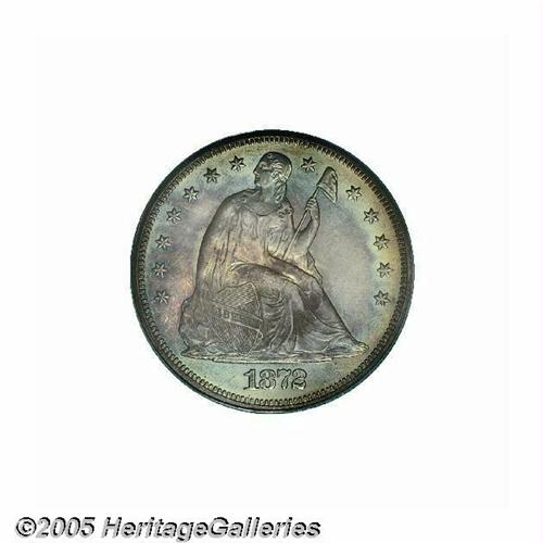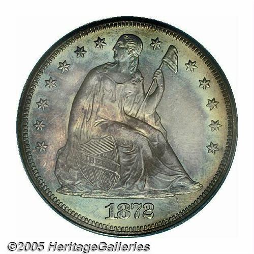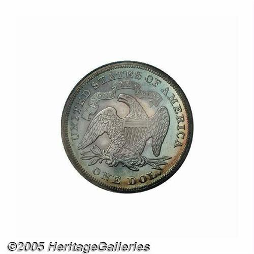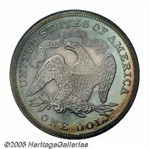 <B>1872<S$1> PR65 PCGS.</B></I>Toned with dark green and blue around most of the periphery of the obverse, with pink and rose tones to the center. The reverse is well matched, with deep blue, yellow and rose colors over the entire surface. If you appreciate toned coins, then this one should work well for your collection. Of the 950 Proofs struck, few remain in Gem condition, and time and attrition have taken a mighty toll. Close examination will find few faults, as expected for the grade. We note a "V" shaped lintmark over the E of AMERICA near the reverse rim which will serve to identify this coin. Population: 17 in 65, 1 finer (6/05).<BR><I>From The Melrose Bay Collection.</B></I>