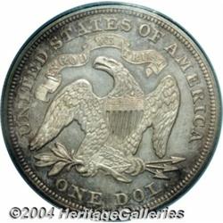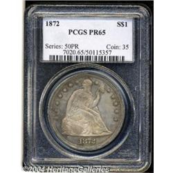 <B>1872<S$1> PR65 PCGS.</B></I> Both sides of this high grade With Motto Proof Dollar are nicely reflective (as the coin is turned under a light source) with nary a distracting blemish to report. An undoubtedly original coin, the otherwise soft, champagne-gray patina yields to more vibrant reddish and electric-blue rim accents. Extremely sharp and worthy of any fine collection. Population: 15 in 65, 2 finer (3/04). <BR><BR><B>Important notice:</B> Heritage usually auctions material at the rate of 200-250 lots per hour. On some occasions eBay Live bid software or the Internet may not be able to keep up with the pace of the auction. We recommend placing a realistic absentee bid now as insurance to avoid disappointment. Occasionally the auctioneer may eliminate or reject an eBay Live bid, and the auctioneer may also reopen a lot after the close of the eBay live bidding (usually because we missed an audience bid), and may reject your bid even if it shows you as the winning bidder. By bidding via eBay Live, you agree that Heritage may award the lot to another bidder at its sole discretion under the circumstances described above or any other reasonable circumstances. Since eBay bids are not shown to us until we open the lot on the floor, we treat those bids just like floor bids. In most cases the floor responds before the eBay bid is presented to us, due to Internet lag time, so for consistency we have made it a policy that floor bids are always considered first over tie eBay live bids. Also please note that all Heritage lots purchased through eBay Live carry a 20% Buyer's Premium. Please make sure you read the Terms and Conditions before you bid. </span></font></tr></table></td></tr></table>