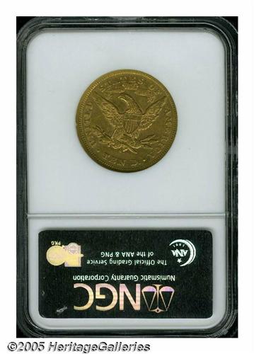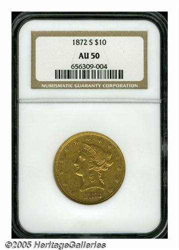 <B>1872-S<$10> AU50 NGC.</B></I> A very rare coin in any condition, when found most '72-S tens are only VF and coins above XF are virtually unobtainable. The present example is typically marked for the grade, and traces of luster still remain in the protected areas. A light pin scratch is noted on Liberty's neck for accuracy.