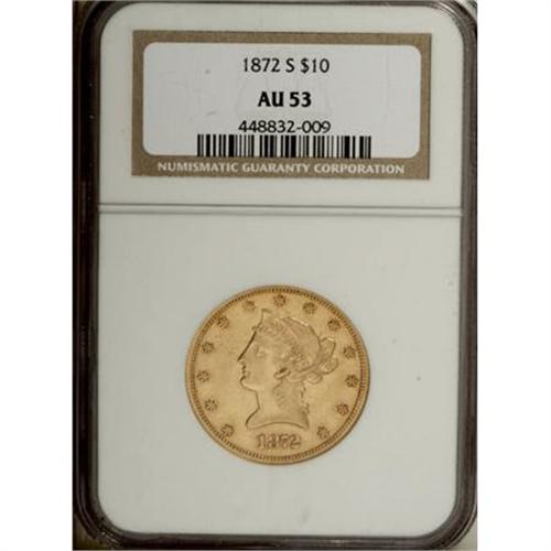 <B>1872-S $10 AU53 NGC.</B></I> The 1872-S, with a mintage of 17,300 pieces, is usually seen in Extremely Fine grades, with anything finer elusive. This AU53 example displays yellow-gold surfaces that retain traces of luster in the protected areas. Good definition is noted on the design elements, save for softness in some of the star centers and portions of Liberty's hair. Minor flaws are consistent with the grade. Census: 12 in 53, 33 finer (12/07).<BR><BR><B>Coin Engraver:</B> Christian Gobrecht<BR><BR><b>Shipping:</b> Coins & Currency (<a target="_blank" href="http://www.heritageauctions.com/common/shipping.php">view shipping information</a>)