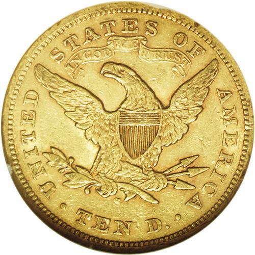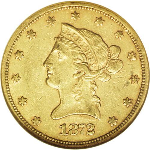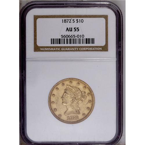 <B>1872-S $10 AU55 NGC.</B></I> A nicely struck golden-brown example of this difficult low mintage issue. Some handling marks are seen on the obverse field near 3 o'clock, but the remainder of the piece is only moderately abraded. The San Francisco Mint concentrated on Double Eagle production during this era, a more convenient denomination for reserves and exports. Census: 13 in 55, 10 finer (12/05).