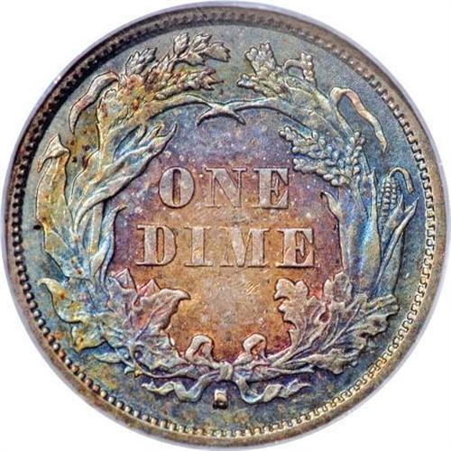<B>1872-S 10C MS63 NGC.</B></I> Much scarcer than the mintage of 190,000 pieces suggests. This is a lovely Mint State coin that shows the usual bright, semi-prooflike fields and die cracks at the top of the date and from the base of the rock to the U. Sharply struck, which is unusual for the issue, the obverse is generally untoned in the center with golden-brown and blue peripheral toning with deep, multicolored toning over the entire reverse. Census: 3 in 63, 1 finer (10/07).<BR><BR><B>Coin Engraver:</B> Christian Gobrecht<BR><BR><b>Shipping:</b> Coins & Currency (<a target="_blank" href="http://www.heritageauctions.com/common/shipping.php">view shipping information</a>)
