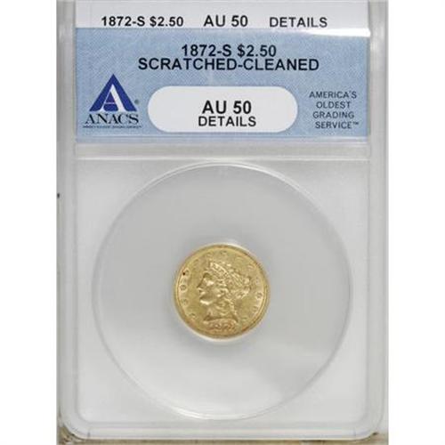 <B>1872-S $2 1/2 --Cleaned, Scratched--ANACS. AU50 Details.</B></I> NGC Census: (12/92). PCGS Population (14/32). Mintage: 18,000. Numismedia Wsl. Price for NGC/PCGS coin in AU50: $925. (#7816)<BR><BR><B>Coin Engraver:</B> Christian Gobrecht<BR><BR><b>Shipping:</b> Coins & Currency (<a target="_blank" href="http://www.heritageauctions.com/common/shipping.php">view shipping information</a>)