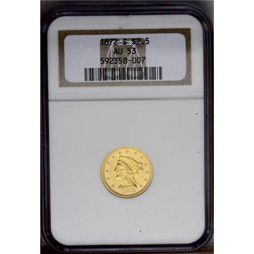 <B>1872-S<$2 1/2> AU53 NGC.</B></I> A partly lustrous representative with bright and comparatively unblemished fields. The eagle's neck and leg show minor strike incompleteness. A mere 18,000 pieces were issued. Census: 12 in 53, 60 finer (3/06). <BR><BR><B>Important notice:</B> Heritage usually auctions material at the rate of 200-250 lots per hour. On some occasions eBay Live bid software or the Internet may not be able to keep up with the pace of the auction. We recommend placing a realistic absentee bid now as insurance to avoid disappointment. Occasionally the auctioneer may eliminate or reject an eBay Live bid, and the auctioneer may also reopen a lot after the close of the eBay live bidding (usually because we missed an audience bid), and may reject your bid even if it shows you as the winning bidder. By bidding via eBay Live, you agree that Heritage may award the lot to another bidder at its sole discretion under the circumstances described above or any other reasonable circumstances. Since eBay bids are not shown to us until we open the lot on the floor, we treat those bids just like floor bids. In most cases the floor responds before the eBay bid is presented to us, due to Internet lag time, so for consistency we have made it a policy that floor bids are always considered first over tie eBay live bids. Also please note that all Heritage lots purchased through eBay Live carry a 20% Buyer's Premium. Please make sure you read the Terms and Conditions before you bid. This lot is being auctioned in conjunction with a live floor auction by Heritage Galleries & Auctioneers. All final auction and invoice information will be supplied by Heritage Galleries & Auctioneers, and all other information should be considered preliminary. Lot:2426 <BR><BR><B>Winning Notification and Billing:</B> After the FINAL session in this auction is complete, Heritage will send e-mail and snail mail invoices. This process normally takes several days. All final auction and invoice information will be supplied by Heritage Galleries & Auctioneers, and all other information should be considered preliminary. <BR><BR>This auction will be conducted on a live auction floor and over the Internet through eBay Live. If you choose to place an absentee bid, please take a moment to <font color='#0000ff'><u><a href='http://pages.ebay.com/liveauctions/help/before/laabsentee.html'>learn how eBay Live absentee bidding works</a></u></font><font color='#000000'>