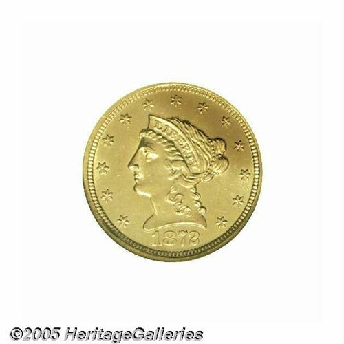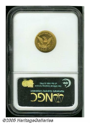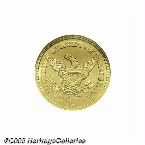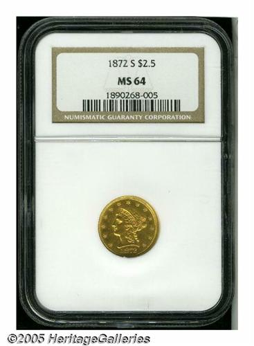 <B>1872-S<$2 1/2> MS64 NGC.</B></I> Richly colored with few appreciable surface marks on the obverse and only a few wispy abrasions above the eagle on the reverse. The striking details are only slightly deficient on the curls over Liberty's ear and the eagle's left (facing) leg. As with any S-mint Quarter Eagle from this era, the 1872-S is a conditionally rare issue, being very scarce even in lesser Uncirculated grades. The present example represents solid Condition Census, unsurpassable quality. Population: 3 in 64, 0 finer (6/05).