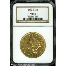 1872-S $20 AU55 NGC. Quite lustrous with no heavy <B>1872-S $20 AU55 NGC.</B></I> Quite lustrous with no heavy or ill-placed marks. As with most San Francisco gold coins from this era, usually found in circulated condition. <BR><BR><B>Important notice:</B> Heritage usually auctions material at the rate of 200-250 lots per hour. On some occasions eBay Live bid software or the Internet may not be able to keep up with the pace of the auction. We recommend placing a realistic absentee bid now as insurance to avoid disappointment. Occasionally the auctioneer may eliminate or reject an eBay Live bid, and the auctioneer may also reopen a lot after the close of the eBay live bidding (usually because we missed an audience bid), and may reject your bid even if it shows you as the winning bidder. By bidding via eBay Live, you agree that Heritage may award the lot to another bidder at its sole discretion under the circumstances described above or any other reasonable circumstances. Since eBay bids are not shown to us until we open the lot on the floor, we treat those bids just like floor bids. In most cases the floor responds before the eBay bid is presented to us, due to Internet lag time, so for consistency we have made it a policy that floor bids are always considered first over tie eBay live bids. Also please note that all Heritage lots purchased through eBay Live carry a 20% Buyer's Premium. Please make sure you read the Terms and Conditions before you bid. This lot is being auctioned in conjunction with a live floor auction by Heritage Galleries & Auctioneers. All final auction and invoice information will be supplied by Heritage Galleries & Auctioneers, and all other information should be considered preliminary. Lot:6878