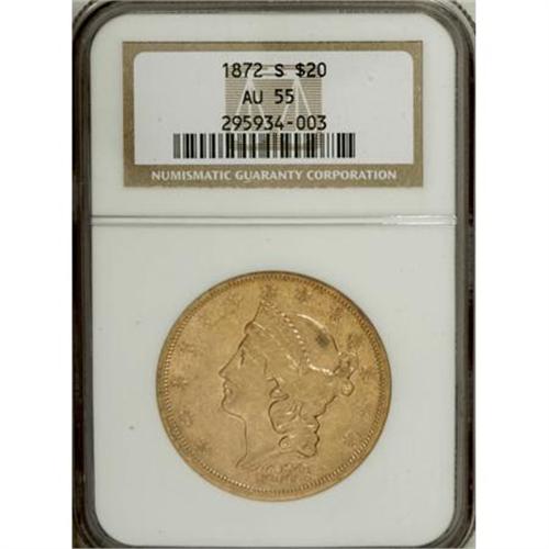 <B>1872-S $20 AU55 NGC.</B></I> NGC Census: (265/410). PCGS Population (64/99). Mintage: 780,000. Numismedia Wsl. Price for NGC/PCGS coin in AU55: $800. (#8965)<BR><BR><B>Coin Engraver:</B> James B. Longacre<BR><BR><b>Shipping:</b> Coins & Currency (<a target="_blank" href="http://www.heritageauctions.com/common/shipping.php">view shipping information</a>\)