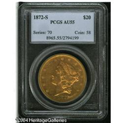<B>1872-S $20 AU55 PCGS.</B></I> A lightly handled example of this popular Type Two issue. The surfaces have a deep reddish cast and the devices are well defined overall.