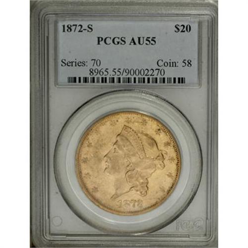 <B>1872-S $20 AU55 PCGS.</B></I> PCGS Population (64/99). NGC Census: (277/433). Mintage: 780,000. Numismedia Wsl. Price for NGC/PCGS coin in AU55: $800. (#8965)<BR><BR><B>Coin Engraver:</B> James B. Longacre<BR><BR><b>Shipping:</b> Coins & Currency (<a target="_blank" href="http://www.heritageauctions.com/common/shipping.php">view shipping information</a>)