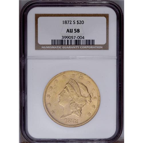 1872-S $20 AU58 NGC. Instantaneously appealing, with f