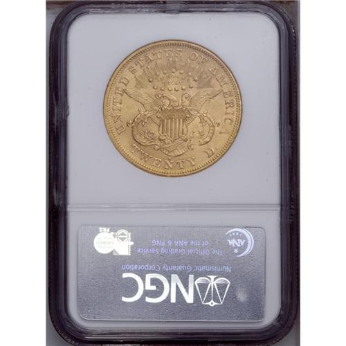 <B>1872-S $20 AU58 NGC.</B></I> Instantaneously appealing, with few noticeable abrasions and lovely honey-gold color. The obverse hair details are incomplete, but most of the obverse stars show some central detail, and the reverse devices are pleasingly bold. NGC has graded 83 examples higher (12/05).