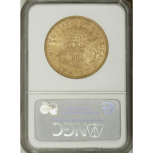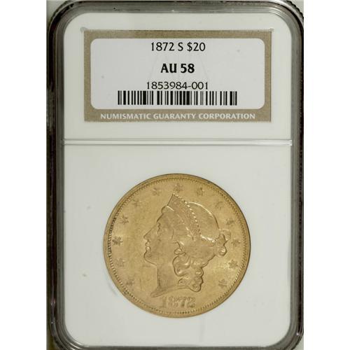 <B>1872-S $20 AU58 NGC.</B></I> The mint luster is essentially complete on the reverse, and partially penetrates the obverse field. An attentively struck and moderately abraded example of this conditionally challenging issue.<BR><BR><b>Shipping:</b> Coins & Currency (<a target="_blank" href="http://www.heritageauctions.com/common/shipping.php">view shipping information</a>)