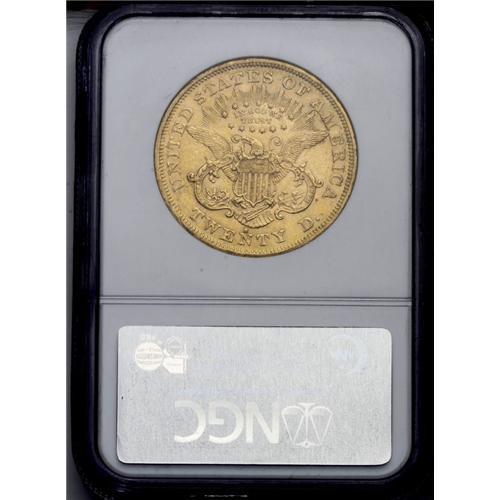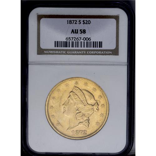 <B>1872-S<$20> AU58 NGC.</B></I> This suitably struck and partly lustrous apricot-gold Type Two double eagle lacks heavy marks. The cheek is particularly clean.