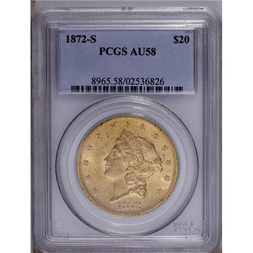 1872-S $20 AU58 PCGS. A coin close to Mint State, with