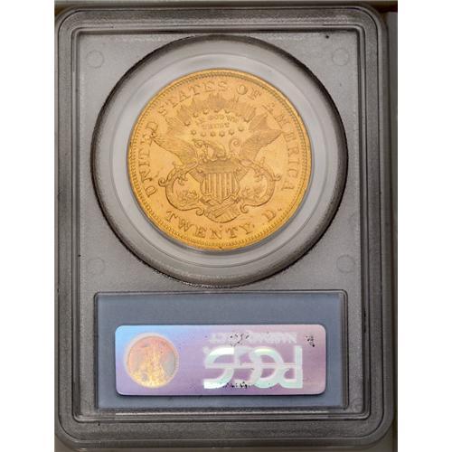 <B>1872-S<$20> AU58 PCGS.</B></I> Peach-gold surfaces display ample luster in the recessed areas, along with well defined motifs. The usual number of marks are scattered about. Population: 55 in 58, 36 finer (6/06).