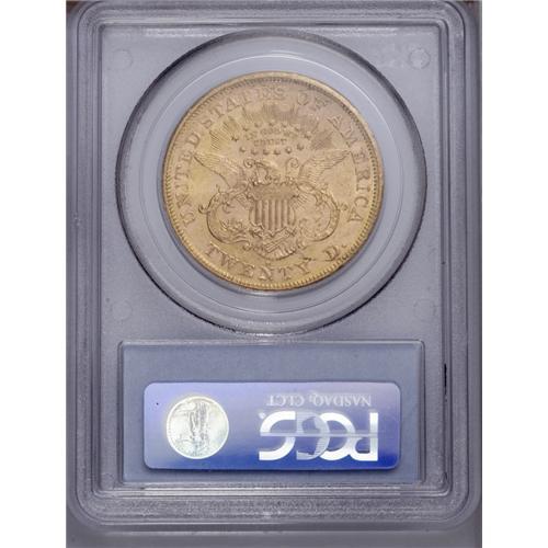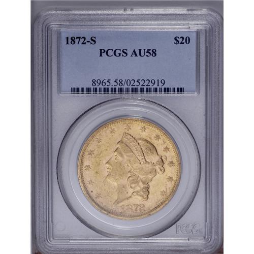 <B>1872-S $20 AU58 PCGS.</B></I> The strike is fairly soft on this coin, and the normal quota of bagmarks, abrasions, and field chatter is present from its brief stint in circulation. Zealous die polishing has effaced parts of the reverse design: the right (facing) side of the eagle's neck, the middle arrow tip, the ornament tip depending nearby, and most of the arrow shafts before the claws. An interesting coin for the specialist.