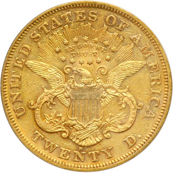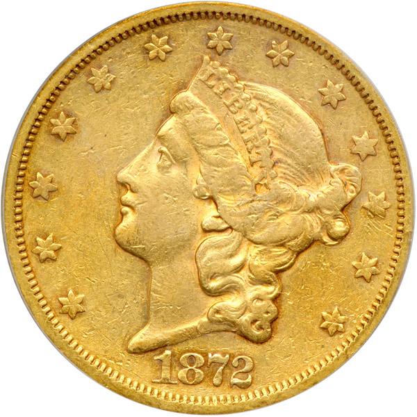 1872-S $20 Liberty. PCGS graded EF-45. Lovely golden toning. An attractive golden double eagle from the Golden State, the home to the 19th century Gold Rush and struck from locally mined ores. Well struck for the issue; typical surface marks from circulation. Traces of luster around the letters (PCGS # 8965) .
