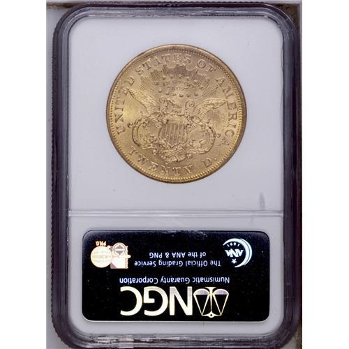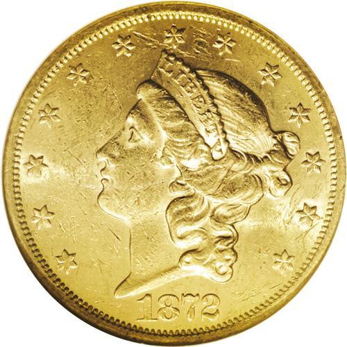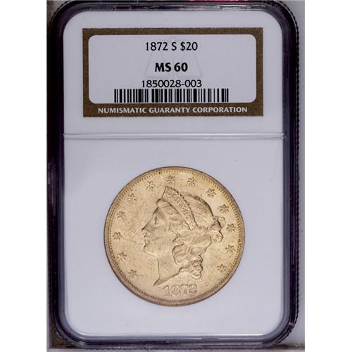 <B>1872-S<$20> MS60 NGC.</B></I> This date is scarce in Mint State grades, even at this lowest numerical level. It is well-struck and fully lustrous with myriad abrasions on the obverse, lighter on the reverse. Perhaps 60 to 70 examples still exist in Mint State grades, most no finer than this example. <BR><BR><B>Important notice:</B> Heritage usually auctions material at the rate of 200-250 lots per hour. On some occasions eBay Live bid software or the Internet may not be able to keep up with the pace of the auction. We recommend placing a realistic absentee bid now as insurance to avoid disappointment. Occasionally the auctioneer may eliminate or reject an eBay Live bid, and the auctioneer may also reopen a lot after the close of the eBay live bidding (usually because we missed an audience bid), and may reject your bid even if it shows you as the winning bidder. By bidding via eBay Live, you agree that Heritage may award the lot to another bidder at its sole discretion under the circumstances described above or any other reasonable circumstances. Since eBay bids are not shown to us until we open the lot on the floor, we treat those bids just like floor bids. In most cases the floor responds before the eBay bid is presented to us, due to Internet lag time, so for consistency we have made it a policy that floor bids are always considered first over tie eBay live bids. Also please note that all Heritage lots purchased through eBay Live carry a 20% Buyer's Premium. Please make sure you read the Terms and Conditions before you bid. This lot is being auctioned in conjunction with a live floor auction by Heritage Galleries & Auctioneers. All final auction and invoice information will be supplied by Heritage Galleries & Auctioneers, and all other information should be considered preliminary. Lot:4237 <BR><BR><B>Winning Notification and Billing:</B> After the FINAL session in this auction is complete, Heritage will send e-mail and snail mail invoices. This process normally takes several days. All final auction and invoice information will be supplied by Heritage Galleries & Auctioneers, and all other information should be considered preliminary. <BR><BR>This auction will be conducted on a live auction floor and over the Internet through eBay Live. If you choose to place an absentee bid, please take a moment to <font color='#0000ff'><u><a href='http://pages.ebay.com/liveauctions/help/before/laabsentee.html'>learn how eBay Live absentee bidding works</a></u></font><font color='#000000'>