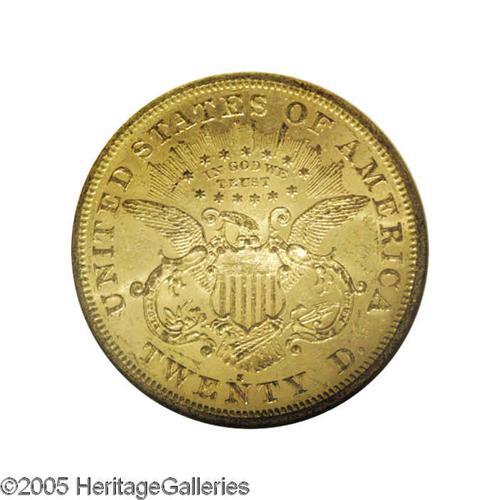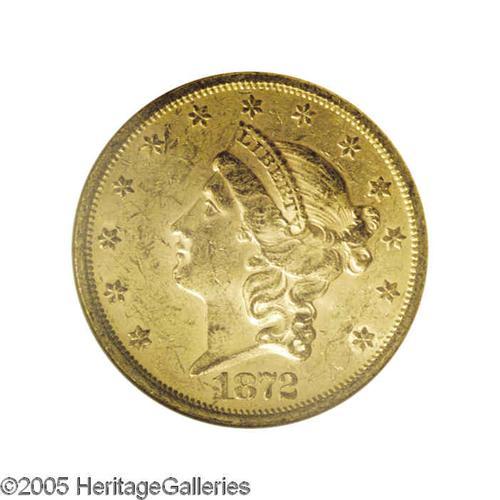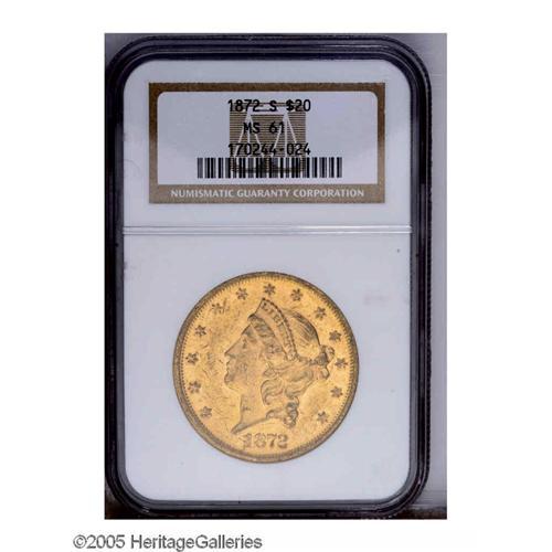 <B>1872-S<$20> MS61 NGC.</B></I> Glowing straw-gold luster is prevalent on this typically marked but well struck Double Eagle. The 1872-S is significantly tougher in Mint State than its mintage of 780,000 pieces suggests. The mintmark was entered too far to the left, and is centered above the N in TWENTY. Census: 46 in 61, 4 finer (11/05).<BR><I>From The Meads Point Collection.</B></I>