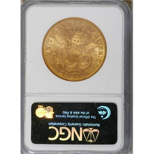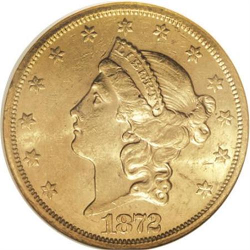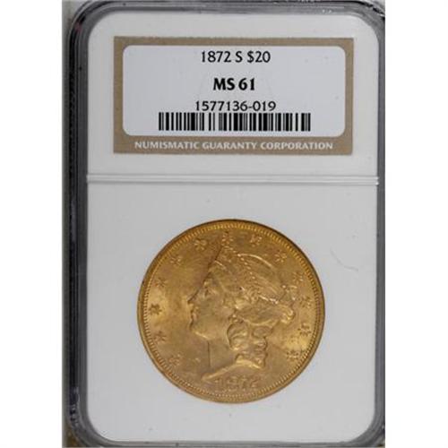 <B>1872-S $20 MS61 NGC.</B></I> One of the more frequently seen Type Two twenties, the 1872-S is occasionally encountered in the various AU grades but it is rare in mint condition. How rare? Only 10 pieces have been certified by both services in finer condition than this piece. The surfaces show full mint luster and are obviously frosted. Sharply struck. Each side shows the usual number of abrasions expected from a gold coin in this grade and the only larger, and therefore mentionable ones, are located in the right obverse field. A rare opportunity for the gold collector.<BR><BR><B>Coin Engraver:</B> James B. Longacre<BR><BR><b>Shipping:</b> Coins & Currency (<a target="_blank" href="http://www.heritageauctions.com/common/shipping.php">view shipping information</a>)