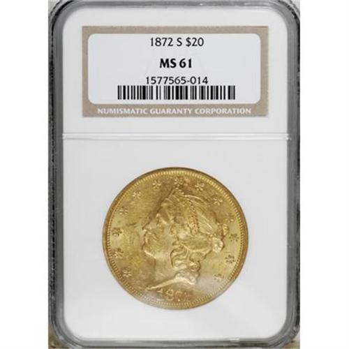 <B>1872-S $20 MS61 NGC.</B></I> Among Type Two twenties, the 1872-S is not one of the more available issues in mint condition. It is often available in AU grades, but Uncirculated coins top out at MS61 with only 10 coins certified finer by both of the major services combined (10/07). This is a lustrous example that has rich reddish patina over each side. A number of small to medium-sized obverse marks account for the MS61 grade.<BR><BR><B>Coin Engraver:</B> James B. Longacre<BR><BR><b>Shipping:</b> Coins & Currency (<a target="_blank" href="http://www.heritageauctions.com/common/shipping.php">view shipping information</a>)