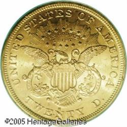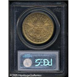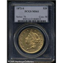 <B>1872-S $20 MS61 PCGS.</B></I> A frosty and lustrous coin that has a decent strike and surfaces which lack the heavy marks so often associated with double eagles from this era. We do note a reeding mark touching the lower left star point and extending both directions above and below on the seventh star, and another reeding mark hidden in Liberty's curls behind her eye at that level. Decidedly rare in any mint state grade and this attractive coin deserves an appreciative collector. Population: 10 in 61, 3 finer (1/05). Lot:9059