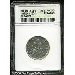 <B>1872-S<25C>--Cleaned--ANACS. AU Details, Net AU50.</B></I> With an original mintage of only 83,000 pieces and a heavy rate of circulation, this issue outstrips even the legendary 1864-S for top rarity honors among S-mint Seated Quarters. This high grade example is well defined with no singularly mentionable marks or abrasions. Unfortunately, someone tried to "improve" the appearance by cleaning the coin, resulting in numerous hairlines over each side. Essentially untoned throughout. <BR><BR><B>Important notice:</B> Heritage usually auctions material at the rate of 200-250 lots per hour. On some occasions eBay Live bid software or the Internet may not be able to keep up with the pace of the auction. We recommend placing a realistic absentee bid now as insurance to avoid disappointment. Occasionally the auctioneer may eliminate or reject an eBay Live bid, and the auctioneer may also reopen a lot after the close of the eBay live bidding (usually because we missed an audience bid), and may reject your bid even if it shows you as the winning bidder. By bidding via eBay Live, you agree that Heritage may award the lot to another bidder at its sole discretion under the circumstances described above or any other reasonable circumstances. Since eBay bids are not shown to us until we open the lot on the floor, we treat those bids just like floor bids. In most cases the floor responds before the eBay bid is presented to us, due to Internet lag time, so for consistency we have made it a policy that floor bids are always considered first over tie eBay live bids. Also please note that all Heritage lots purchased through eBay Live carry a 20% Buyer's Premium. Please make sure you read the Terms and Conditions before you bid.