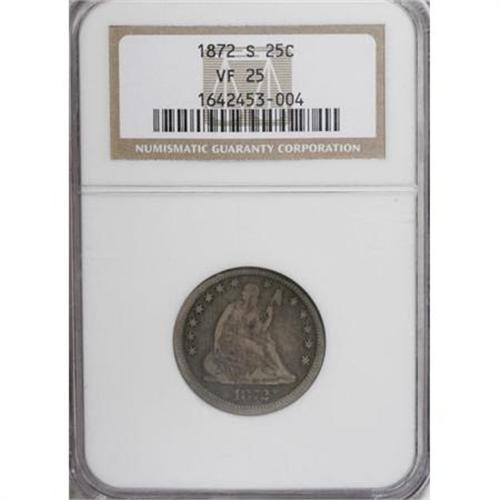 1872-S 25C VF25 NGC. A mere 83,000 quarters were struc