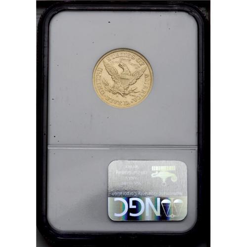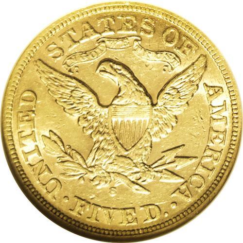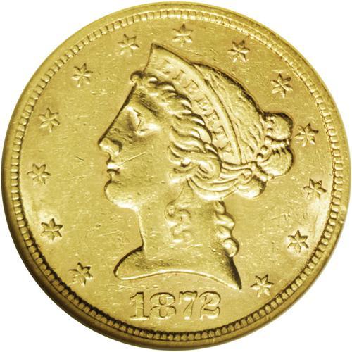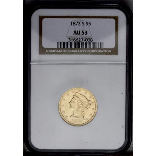 <B>1872-S<$5> AU53 NGC.</B></I> A rarity both in the absolute and conditional senses, even rarer than its mintage of 36,400 pieces would indicate. This lustrous honey-gold example is probably limited from Choice AU grade by the myriad small abrasions on both sides. The strike is well executed save for Liberty's lovelock and the neck and fletchings on the reverse. Census: 11 in 53, 21 finer (3/06).<BR><I>From The Steve Glenn Collection.</B></I> <BR><BR><B>Important notice:</B> Heritage usually auctions material at the rate of 200-250 lots per hour. On some occasions eBay Live bid software or the Internet may not be able to keep up with the pace of the auction. We recommend placing a realistic absentee bid now as insurance to avoid disappointment. Occasionally the auctioneer may eliminate or reject an eBay Live bid, and the auctioneer may also reopen a lot after the close of the eBay live bidding (usually because we missed an audience bid), and may reject your bid even if it shows you as the winning bidder. By bidding via eBay Live, you agree that Heritage may award the lot to another bidder at its sole discretion under the circumstances described above or any other reasonable circumstances. Since eBay bids are not shown to us until we open the lot on the floor, we treat those bids just like floor bids. In most cases the floor responds before the eBay bid is presented to us, due to Internet lag time, so for consistency we have made it a policy that floor bids are always considered first over tie eBay live bids. Also please note that all Heritage lots purchased through eBay Live carry a 20% Buyer's Premium. Please make sure you read the Terms and Conditions before you bid. This lot is being auctioned in conjunction with a live floor auction by Heritage Galleries & Auctioneers. All final auction and invoice information will be supplied by Heritage Galleries & Auctioneers, and all other information should be considered preliminary. Lot:2784 <BR><BR><B>Winning Notification and Billing:</B> After the FINAL session in this auction is complete, Heritage will send e-mail and snail mail invoices. This process normally takes several days. All final auction and invoice information will be supplied by Heritage Galleries & Auctioneers, and all other information should be considered preliminary. <BR><BR>This auction will be conducted on a live auction floor and over the Internet through eBay Live. If you choose to place an absentee bid, please take a moment to <font color='#0000ff'><u><a href='http://pages.ebay.com/liveauctions/help/before/laabsentee.html'>learn how eBay Live absentee bidding works</a></u></font><font color='#000000'>